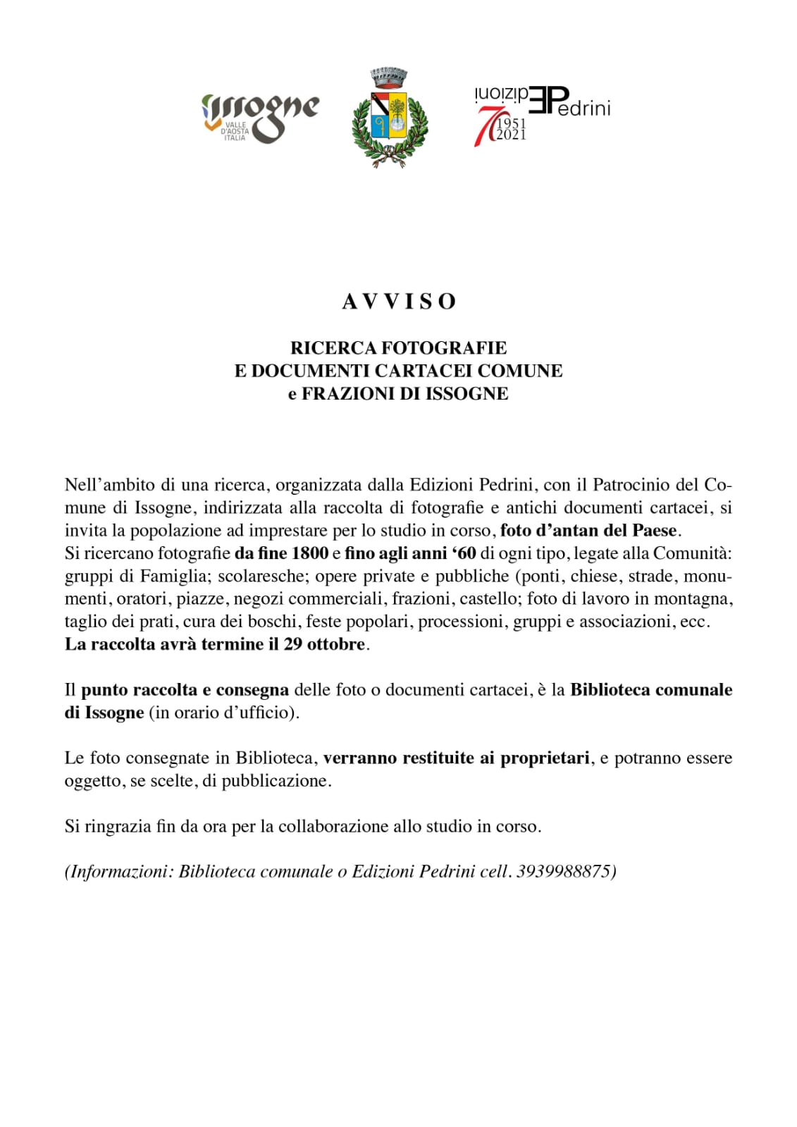 Nell’ambito di una ricerca organizzata dalle edizioni Pedrini con il patrocinio del Comune di Issogne, indirizzata alla raccolta di fotografie e antichi documenti cartacei, si invita la popolazione ad imprestare per lo studio in corso foto d’antan del paese.