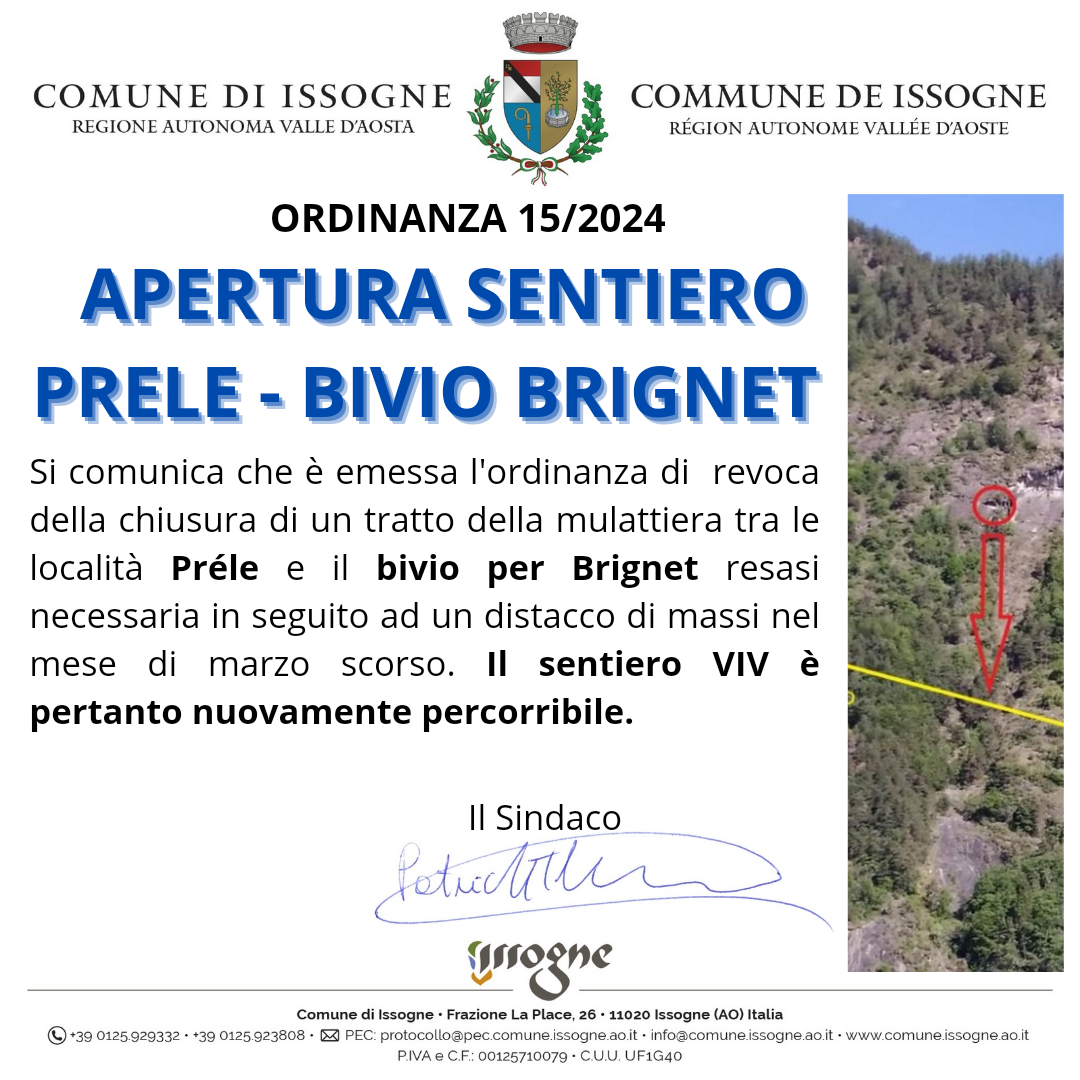 Si comunica che con Ordinanza n. 15/2024 è stata emessa la revoca della chiusura di un tratto di mulattiera tra la località Prele e il bivio per Brignet.