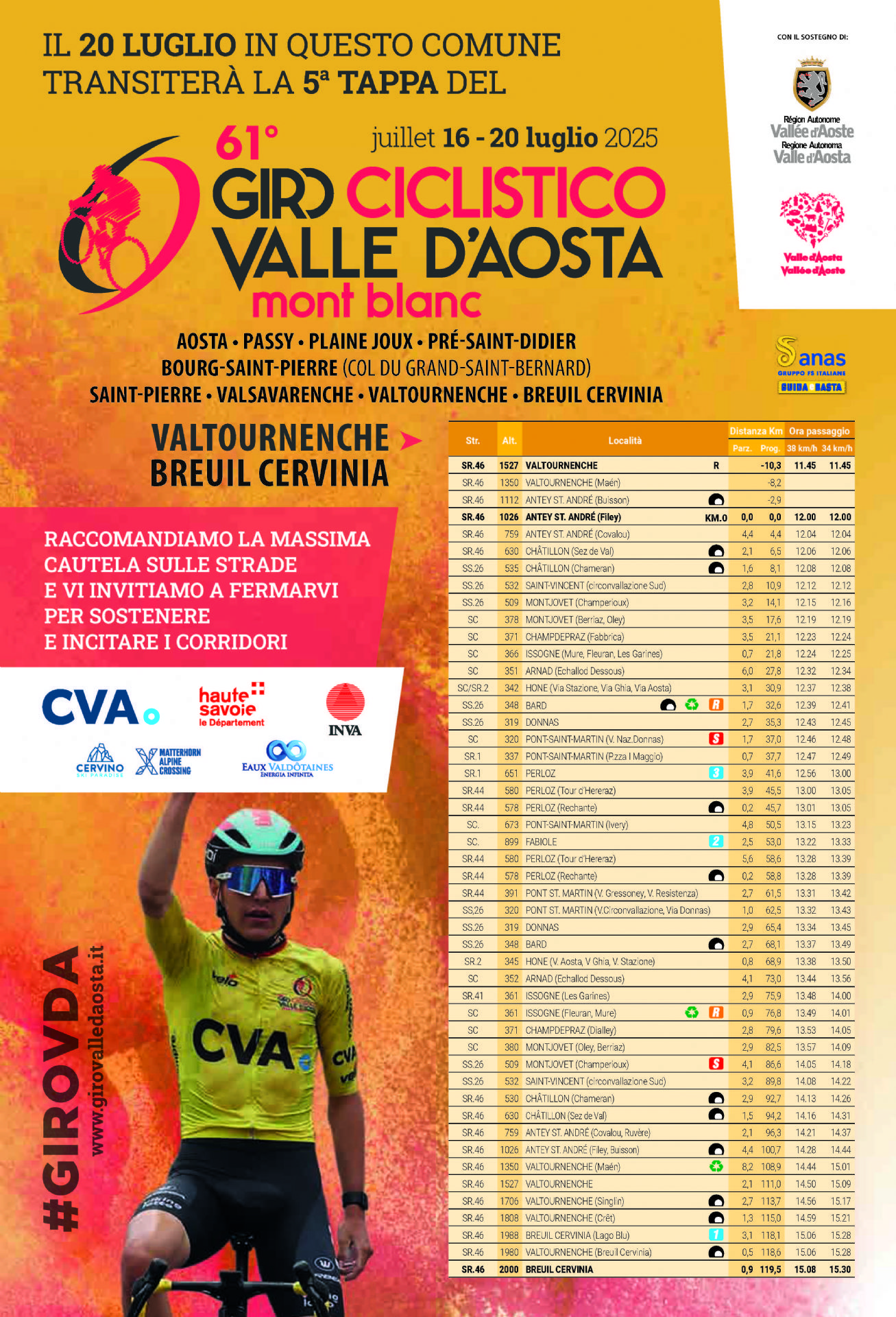 La quinta tappa, conclusiva, domenica 20 luglio 2025, con la tradizionale Valtournenche-Cervinia estesa fino a Pont-Saint-Martin e Perloz, suggellerà un’edizione ricca di emozioni e sfide.