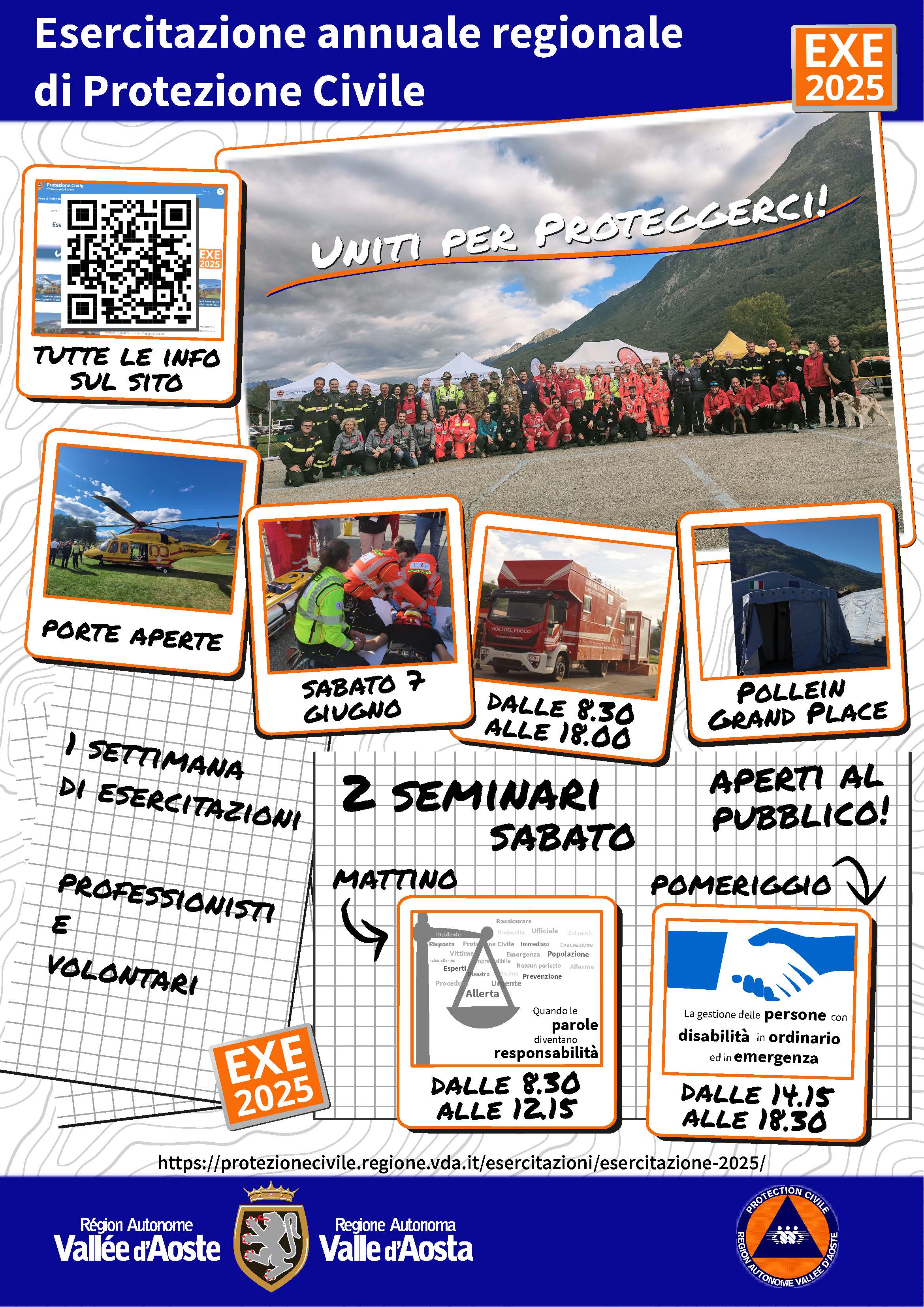 Sabato 7 giugno 2025, presso l’area verde Grand Place di Pollein, si terrà una giornata di porte aperte alla cittadinanza nell’ambito della settimana dedicata all’esercitazione di Protezione Civile regionale.