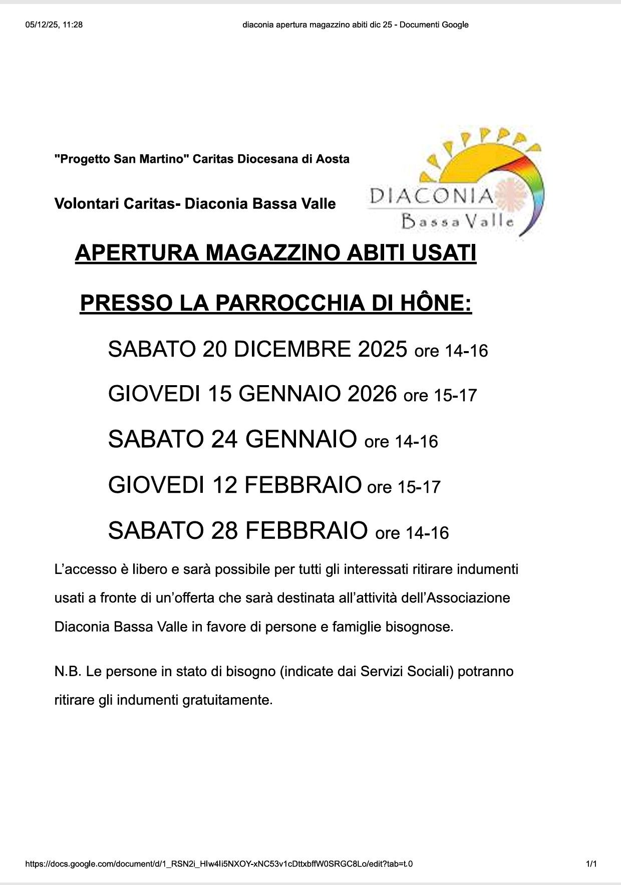 Il magazzino abiti usati della Parrocchia di Hone (gestito da Caritas Diaconia Bassa Valle) riapre la raccolta nei giorni meglio indicati nella locandina.