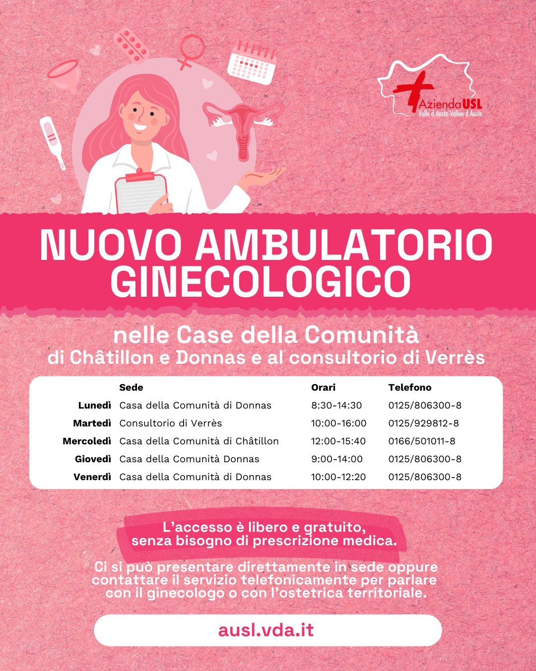 E' stato attivato un nuovo ambulatorio ginecologico nel Distretto 2 dell'Usl della Valle d'Aosta. Il nuovo servizio è operativo nelle case della comunità di Châtillon e Donnas, e nel consultorio di Verrès e "vuole essere un punto di riferimento con un occhio di particolare riguardo per gli adolescenti, ma anche per giovani adulti, nonché per le donne in età fertile e in postmenopausa".