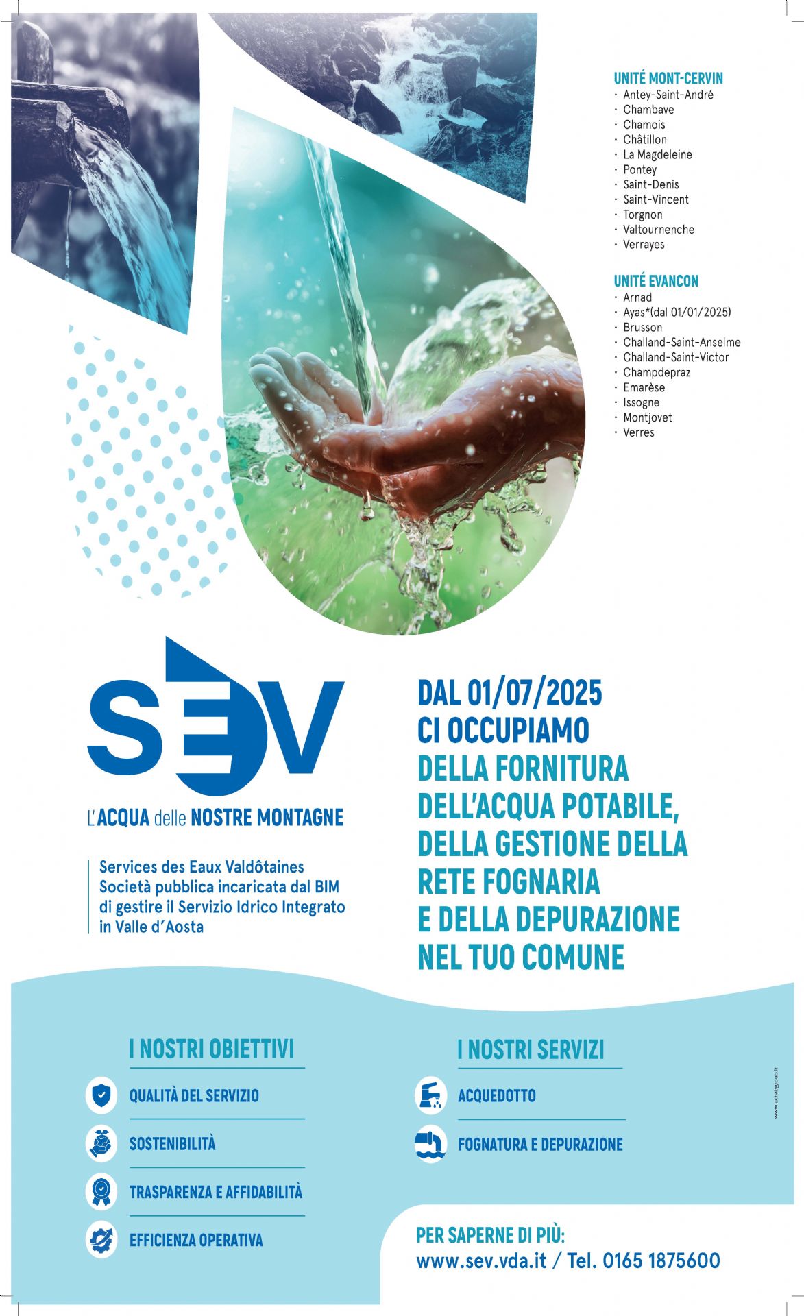 A decorrere dal 1° luglio 2025 il Servizio idrico comunale è sotto la gestione integrata della società Services des Eaux Valdôtaines (SEV) Srl con sede nel comune di Sarre, frazione La Grenade, n. 27, pertanto non è più in carico al comune.