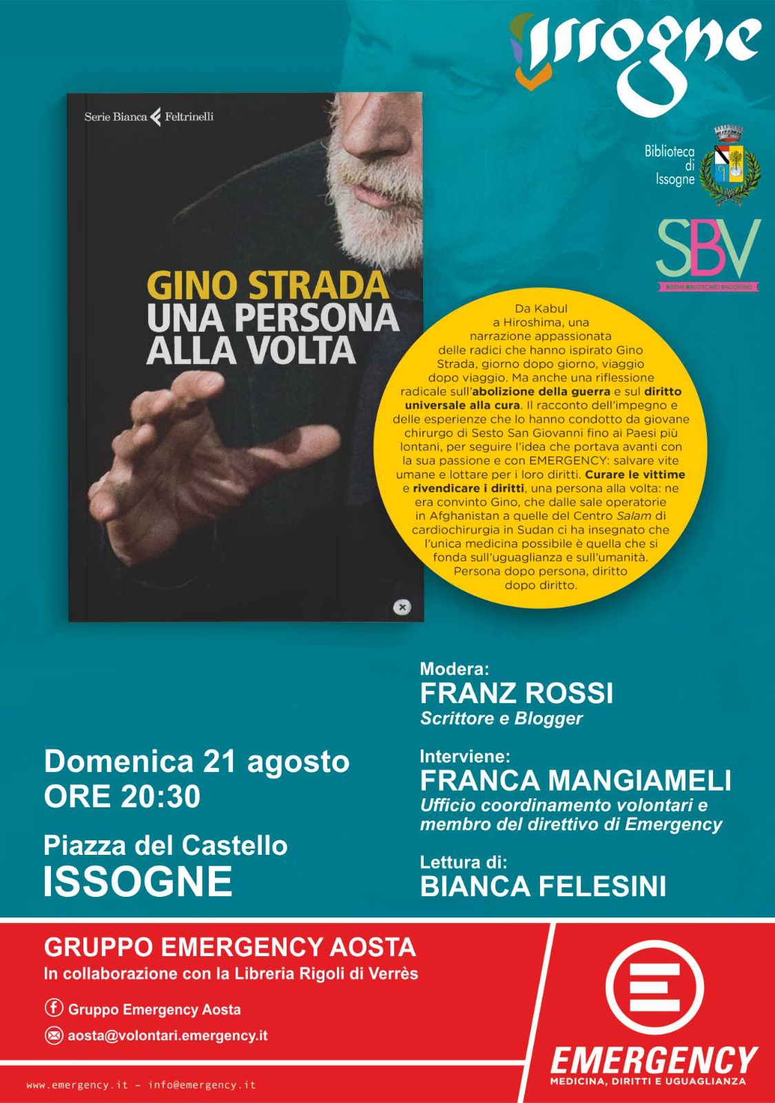 Domenica 21 agosto in piazza ad Issogne si svolgerà la presentazione dell'ultimo libro di Gino Strada, che contiene le testimonianze sulla sua vita, interamente votata ai più deboli.