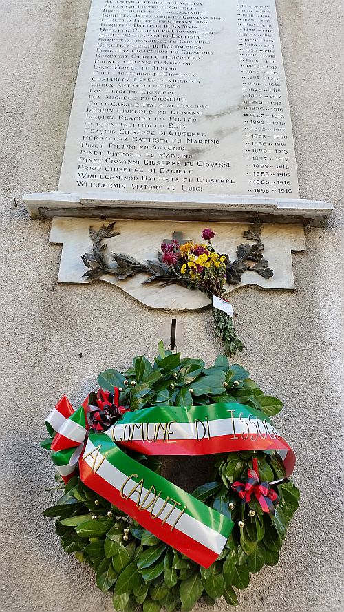 Anche Issogne versò il suo tributo di sangue. Il 19 aprile 1944, Giovanni Battista Mussitelli, rientrato in paese dopo essere emigrato per motivi politici, viene sorpreso a Fleuran da una pattuglia di moschettieri delle Alpi e ferito mortalmente. Il 22 agosto seguente muore Martino Dublanc, stimato vicecomandante della brigata. In combattimento, cadono anche Mario Cout, Camillo Borettaz, Feruccio Foy e Giocondo Jacquin, mentre Aladino Cout muore nel campo di concentramento di Mauthausen.