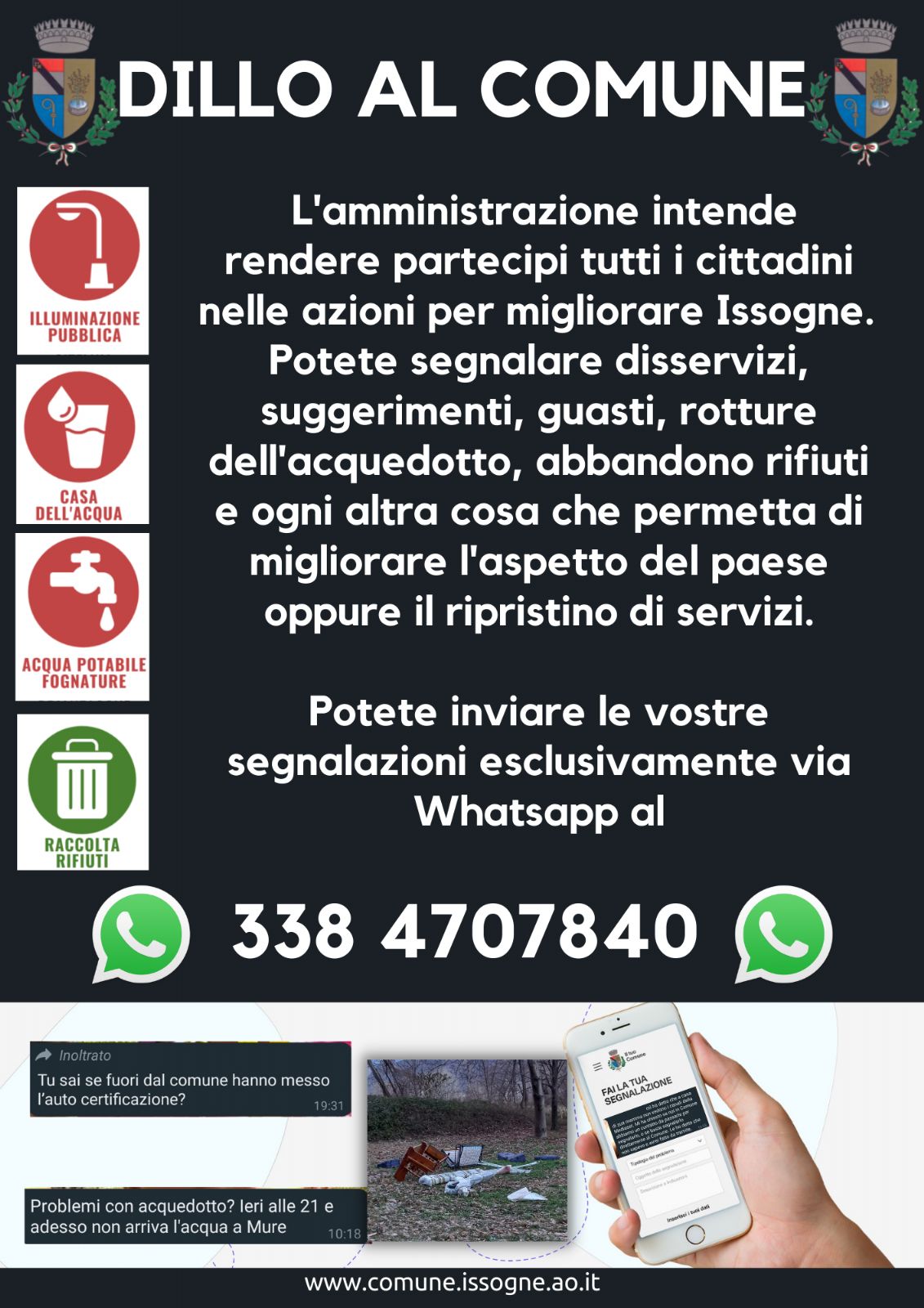 Con un messaggio WhatsApp al numero 338/4707840 sarà possibile inviare segnalazioni, reclami per eventuali disservizi, guasti, rotture dell'acquedotto, abbandono rifiuti e sottoporre all’Amministrazione eventuali suggerimenti per il miglioramento.