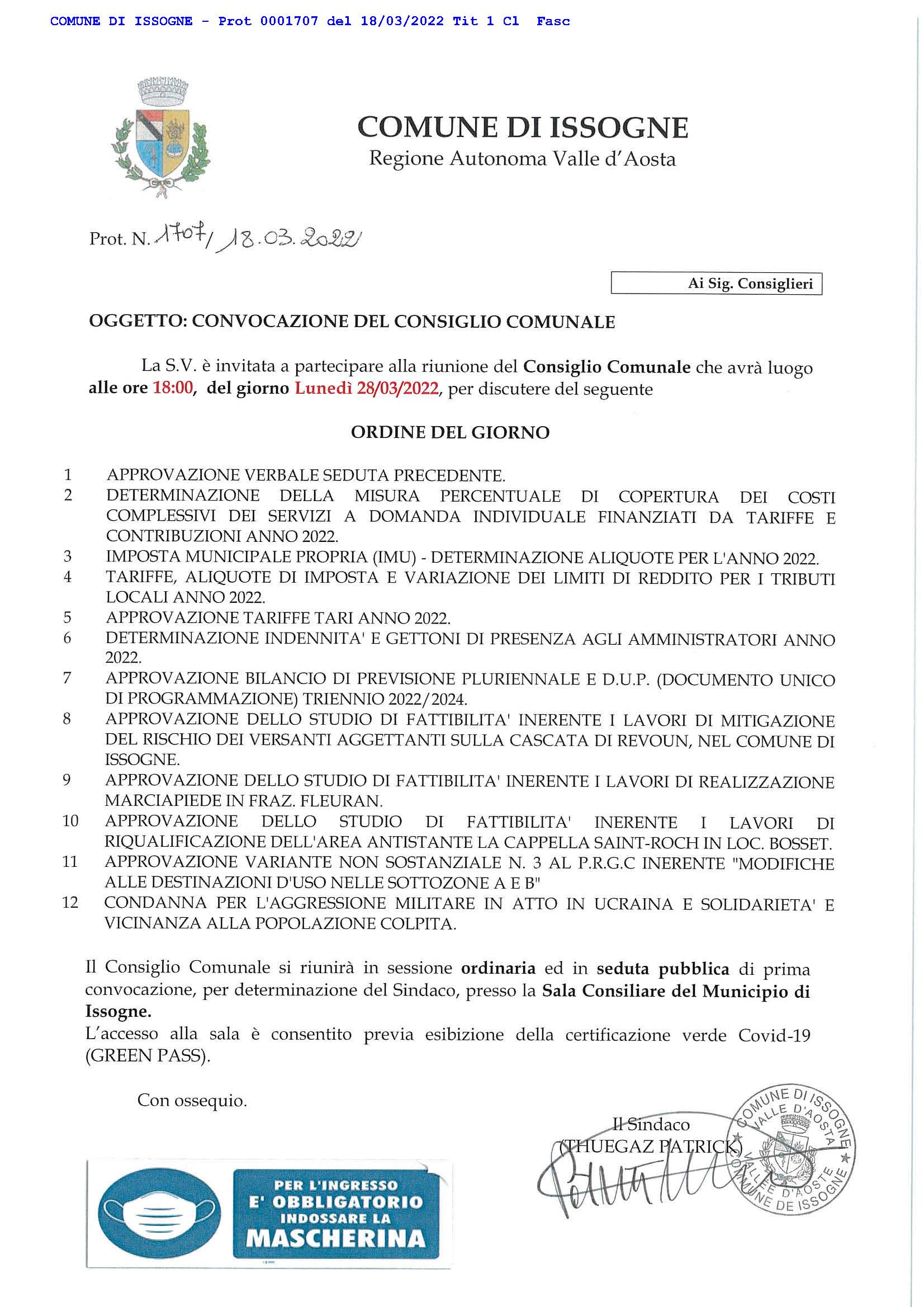 Il Sindaco Ing. THUEGAZ PATRICK ha convocato il Consiglio Comunale per il giorno LUNEDI' 28 MARZO 2022 alle ore 18.00 che si terrà presso la Sala Consiliare del Municipio di Issogne.