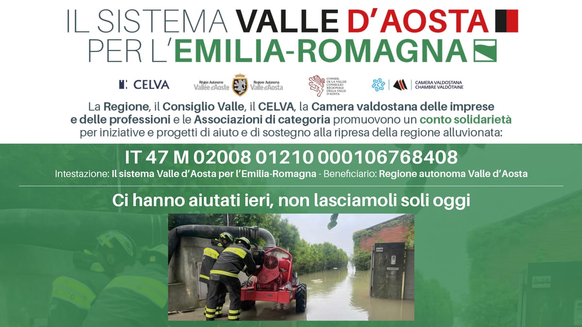 A partire da oggi è attivo il conto corrente IBAN: IT 47 M 02008 01210 000106768408. Intestazione: "Il sistema Valle d’Aosta per l’Emilia Romagna"; Beneficiario: Regione autonoma Valle d'Aosta.