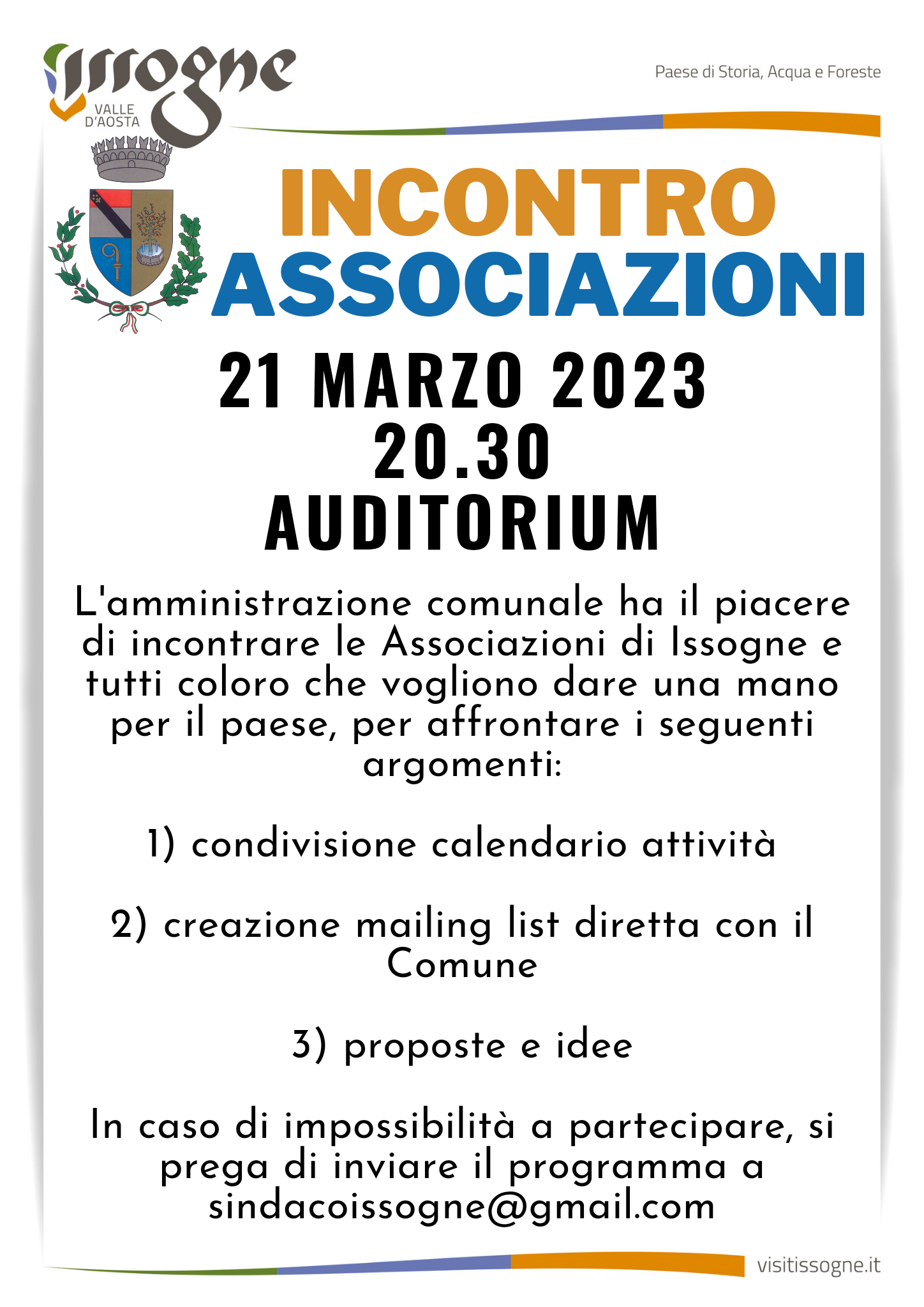 L'Amministrazione Comunale ha il piacere di invitare le Associazioni di Issogne il giorno 21 MARZO 2023 alle ore 20.30 presso l'Auditorium.