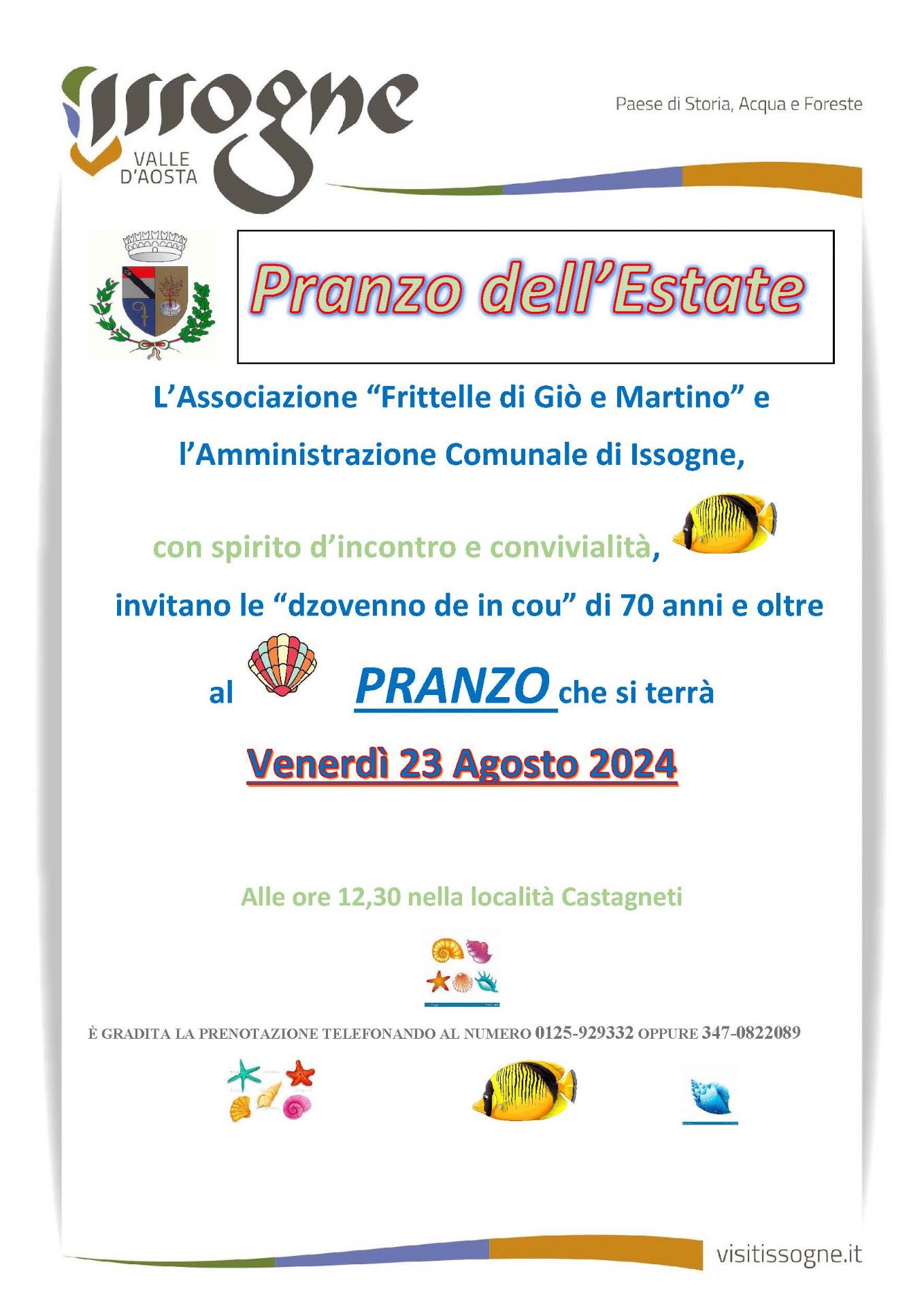 L'Associazione "Frittelle di Giò e Martino" di concerto con l'Amministrazione Comunale di Issogne invitano le "dzovenno de in cou" di anni 70 ed oltre al PRANZO che si terrà VENERDI' 23 AGOSTO 2024 alle ore 12.30 in località Castagneti.