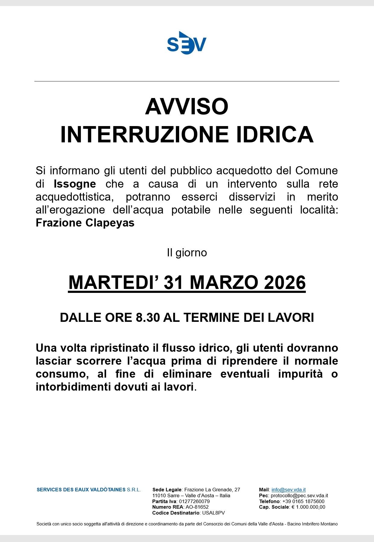 Si informano gli utenti del pubblico acquedotto del Comune di Issogne che a causa di un intervento sulla rete acquedottistica, potranno esserci disservizi in merito all'erogazione dell'acqua potabile nelle seguenti località: