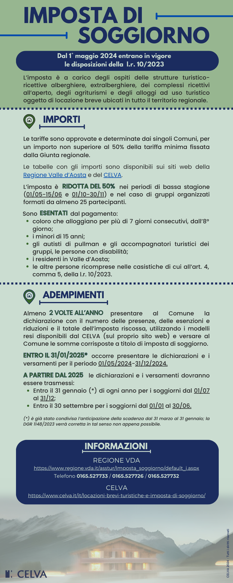 È possibile verificare le tariffe delle singole strutture direttamente sul sito del CELVA. (https://www.celva.it/it/locazioni-brevi-turistiche-e-imposta-di-soggiorno/#imposta)