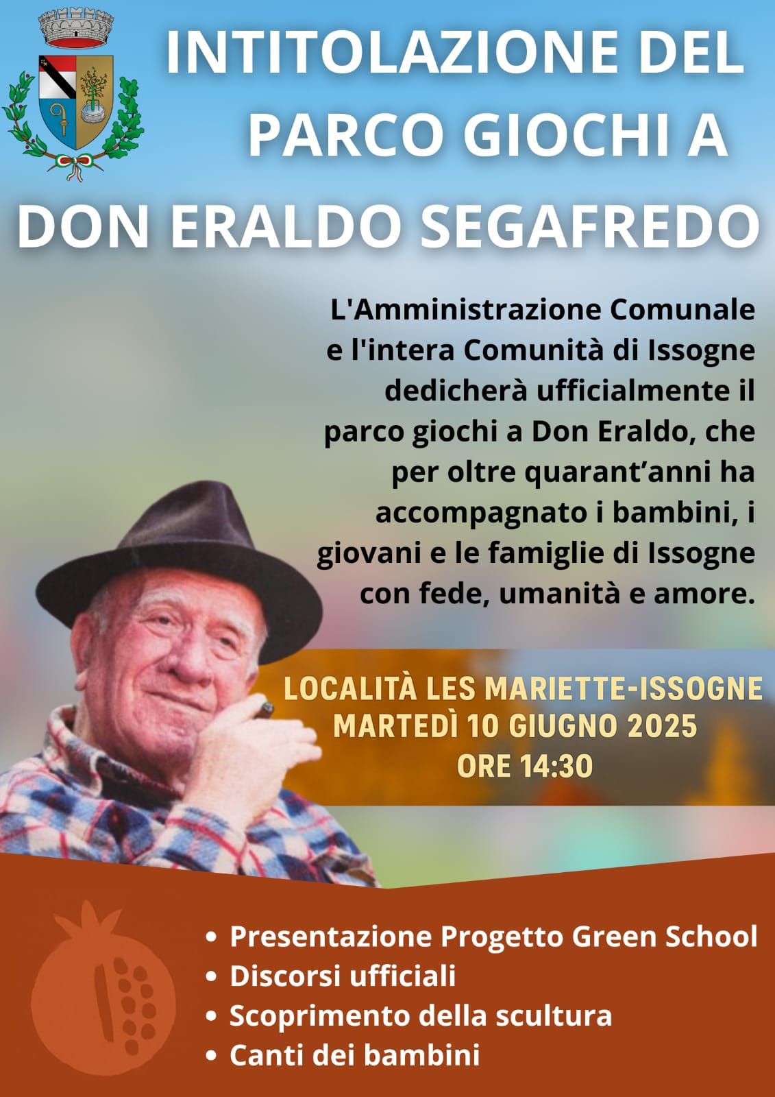 L'Amministrazione Comunale e l'intera Comunità di Issogne dedicherà ufficialmente il parco giochi a Don Eraldo, che per oltre quarant'anni ha accompagnato i bambini, i giovani e le famiglie di Issogne con fede, umanità e amore.