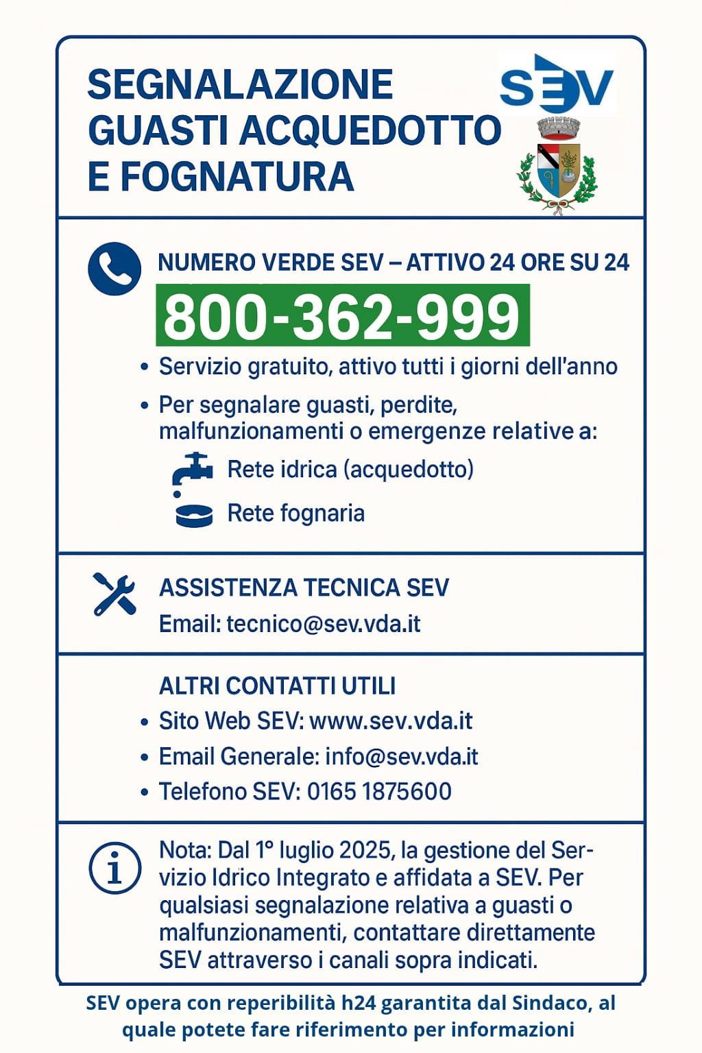 Si ricorda che, a partire dal 1° luglio 2025 il Servizio idrico comunale passerà sotto la gestione integrata della società Services des Eaux Valdôtaines (SEV) Srl con sede nel comune di Sarre, frazione La Grenade, n. 27, che pertanto non è più in carico al comune.