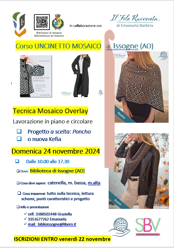 Si terrà ad Issogne domenica 24 novembre 2024 un nuovo incontro, dalle ore 10,00 alle ore 17,30 insegnando la tecnica Overlay per la realizzazione del "Poncho" o della nuova "Kefya"!!