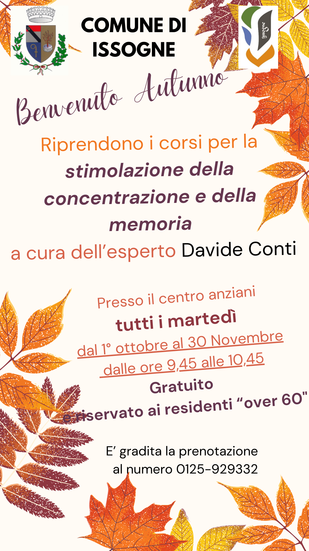 Dal 1° ottobre al 30 novembre, ogni martedì, presso il Centro Anziani dalle ore 09,45 alle ore 10,45.