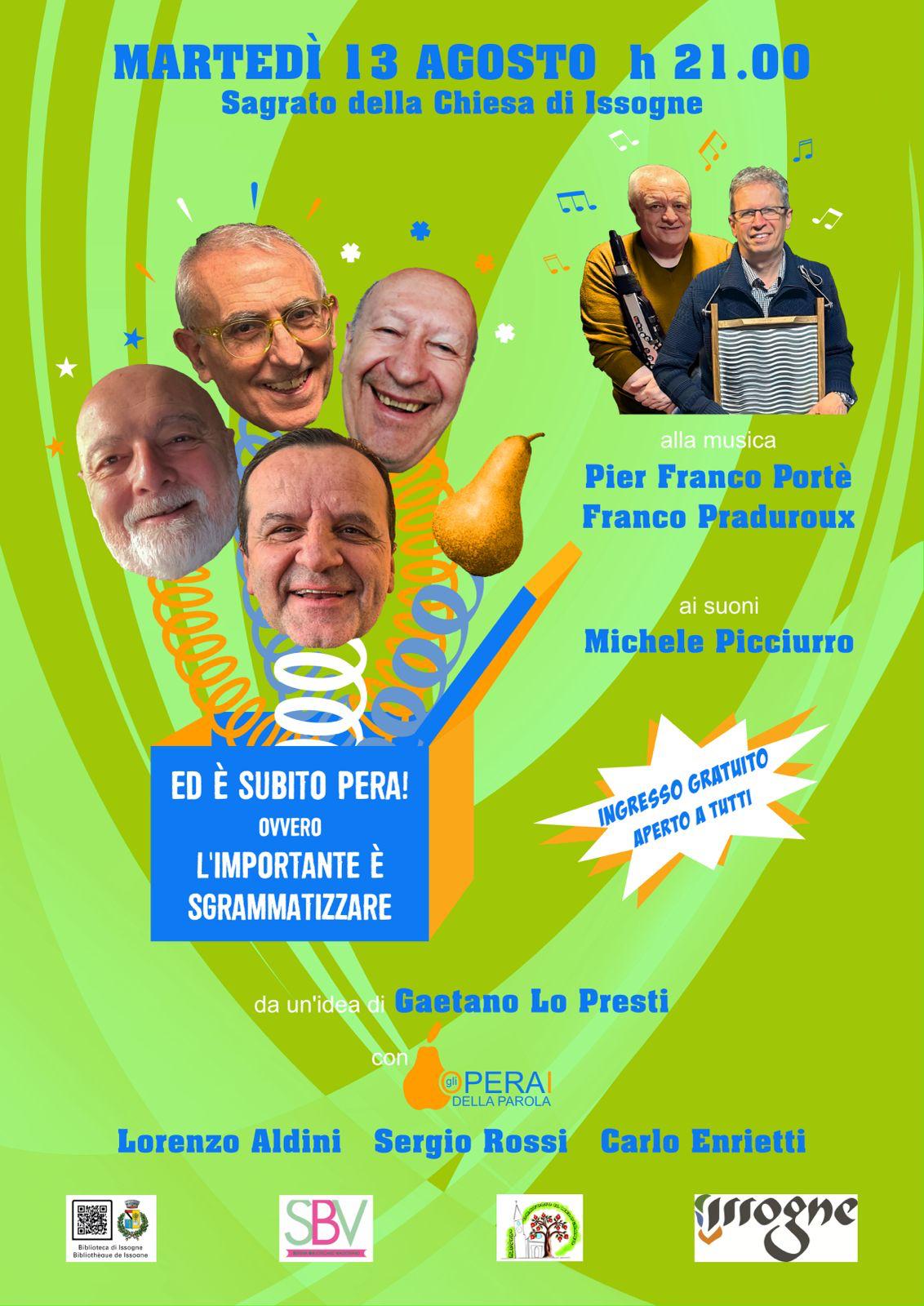 Bisticci, doppi sensi, freddure, lapsus (più o meno finti) sono tutti sinonimi dei giochi di parole che infarciscono i nostri discorsi, rendendoli più interessanti e divertenti. Anche per questo sono molto utilizzati in ambito letterario, giornalistico, pubblicitario e nel mondo dell’intrattenimento. I giochi di parole e derivati saranno al centro della serata “E’ subito pera ovvero L’importante è sgrammatizzare”, organizzata dalla Biblioteca di Issogne, che si terrà martedì 13 Agosto h. 21.00 sul sagrato della chiesa (ingresso gratuito). Ideato dal giornalista Gaetano Lo Presti, l’evento avrà come protagonisti tre giocolieri della parola come Carlo Enrietti Zoppo, Sergio Rossi e Lorenzo Aldini. Storico musicista valdostano, Enrietti fin dalle scuole medie ha evidenziato una passione per la musica ed i giochi di parole. In un’autobiografia scherzosa scrive, tra l’altro, che la sua nascita non ha avuto “grande risonanza, sebbene sia avvenuta in un negozio di strumenti musicali e dischi...” e che l'età avanzata “la metto comunque in frigo”. Di giochi di parole è pieno anche il libro “O pera omgna” di Sergio Rossi, in arte Gerso, cinquantanovenne di Saint-Vincent. Elucubrazioni come “Quando entra al lavoro l’ornitologo timbra il...cardellino”. O “- Siete tutti d’accordo che metta a cuocere la torta? - Sì! Ecco questo è un consenso infornato”. Romagnolo, ma residente in Valle da 15 anni, è, infine, Lorenzo “ilgrandebiglia” Aldini. A Milano ha gestito con successo una serie di locali alla moda. Tra questi il Ragoo di Viale Monza dove passavano i protagonisti dello Zelig cabaret. Alcuni di questi, come il Mago Forest ed Ale e Franz, avevano molto apprezzato le battute ed i calembour per cui Lorenzo è famoso. Un esempio? “C'è un codice d'onore anche per i bugiardi. Il codice a balle”. Anche la musica avrà i suoni insoliti e divertenti del washboard, la tavola per il bucato trasformata a New Orleans in strumento musicale, suonato da Pier Franco Portè, ed il Roland ae 30, strumento a fiato elettronico con cui Franco Praduroux simula centinaia di altri strumenti
